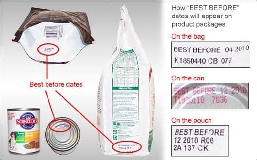 How can I tell if an unopened can or bag of cat or dog food is still good?